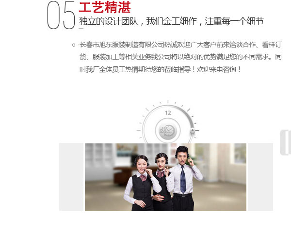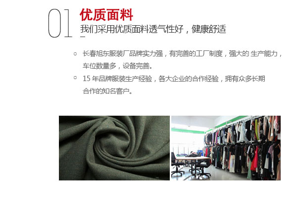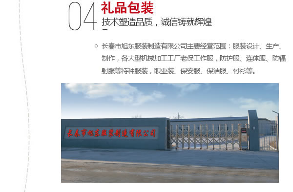 吉林省長春市旭東服裝廠,電話:13578777918,提供工作服,工裝定制,勞保服,保安服,職業(yè)裝定制,本公司是一家集生產,設計,制作,銷售為一體的多元化公司。長春市旭東服裝制造有限公司成立于2003...[查看更多]